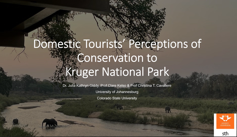 Dr. Julia Kathryn Giddy presented the co-authored work with Dr. Clare Kelso & Dr. Christina T. Cavaliere, titled “Domestic Tourists’ Perceptions of Conservation to Kruger National Park” at the From Recovery to Resilience in Tourism: Sustainable Pathways for Transforming Tourism conference. The conference was held from September 1-5, 2025, at the Maslow hotel Sandton in Johannesburg South Africa. The conference was co-organised by the School of Tourism and Hospitality, University of Johannesburg, and the University of Oulu in Finland. It focused on sustainable pathways for transforming the tourism industry, and its’ community and environmental relations in the context of recovery and resilience building.