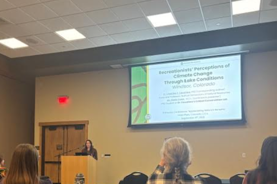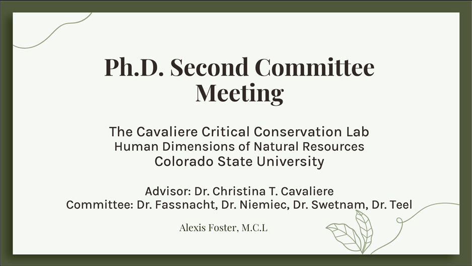 It is with great enthusiasm that The Cavaliere Critical Conservation Lab announces that Alexis R. Foster has advanced from PhD student to PhD candidate. On December 1, 2025, Alexis presented her dissertation topic of “Overtourism Challenges in Two Northern Colorado Recreational Areas: Understanding community perspectives and management approaches in Lory State Park and Horsetooth Reservoir.” This research takes place within the community of Larimer County, specifically Fort Collins and Bellevue, Colorado focused on overtourism perspectives and management approaches at these two locally significant protected areas.